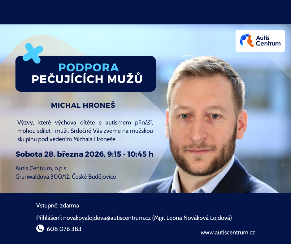 pro velký ohlas a zájem Vás srdečně zveme na druhé setkání mužské podpůrné skupiny, které povede Michal Hroneš – odborník a zároveň tatínek dítěte s poruchou autistického spektra. Odborným garantem mužských skupin je Mgr. Přemysl Mikoláš, psycholog.
